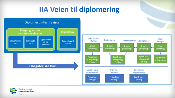 Opplæringsopplegget som nå utarbeides vil bestå av ulike moduler, noen obligatoriske og noen valgfrie. Deler av opplegget vil bli tilbudt som e-læring, mens andre deler tilbys som fysiske kurs. Opplæringen avsluttes med en eksamen som gjennomføres digitalt i form av ‘multiple choice’-oppgaver. IIA-veien vil ikke gi studiepoeng slik som BI-studiet, men 120 CPE-poeng. På samme måte som for BI-studiet kreves det to års relevant praksis for tildeling av tittelen diplomert internrevisor.